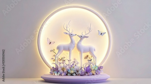 Glowing circular backlit wall ornament depicting a pair of white deer figurines surrounded by lavender flowers on a pale purple pedestal for romantic decor.