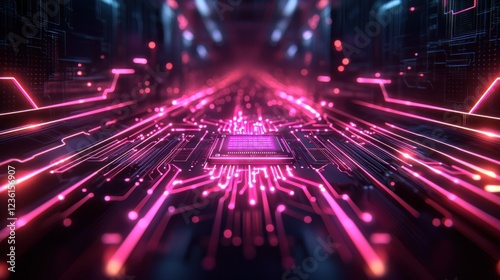 Glowing CPU on circuit board with neon lights, ideal for tech backgrounds