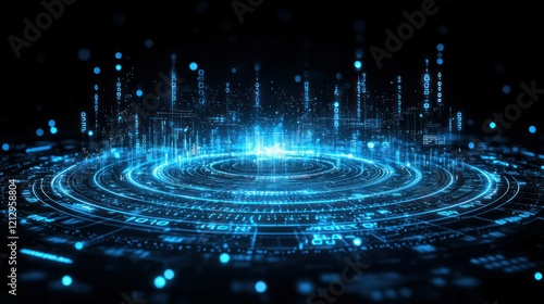Glowing digital data rings with binary code in dark cyberspace.