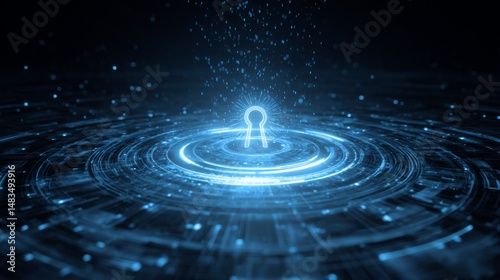 Glowing digital padlock symbol surrounded by concentric circles and particles