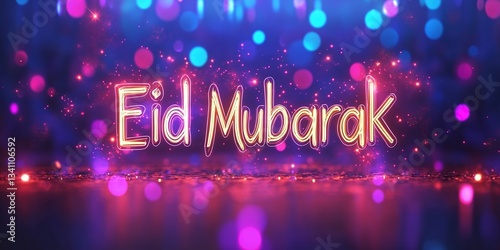 Glowing eid mubarak text with bokeh lights and sparkles on a reflective surface in blue and pink