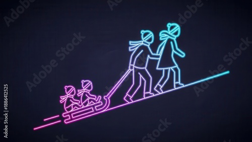 Glowing family winter fun: parents pull children on a sled up a vibrant neon illuminated hill.