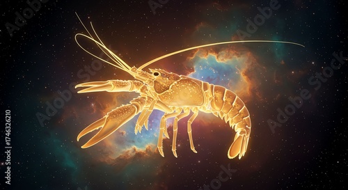 Glowing Golden Lobster Surrounded by Cosmic Nebula in Space