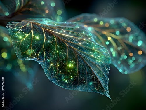 Glowing Green Leaf Veins Transforming into Futuristic Neon Network – Nature Meets AI Concept
