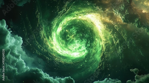 Glowing green spiral emits light, forming a cosmic, energetic scene filled with vibrant motion and life.