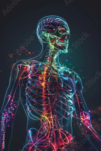 Glowing hologram of human body 3D bone system structure with dark background.