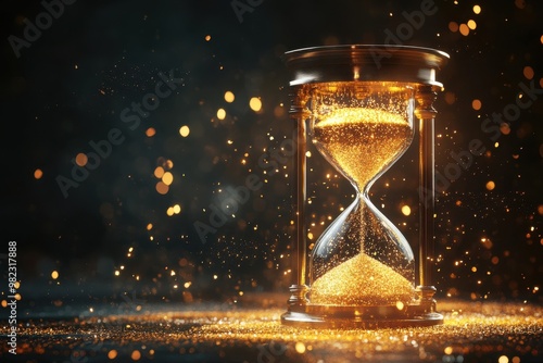 Glowing hourglass with golden sand particles sparkling in the dark background