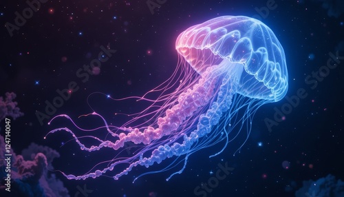 Glowing jellyfish floating in deep dark ocean