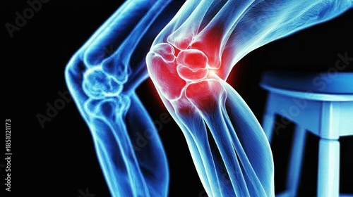 Glowing knee joint with highlighted red pain area, against dark background