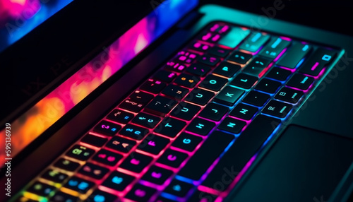 Glowing laptop keyboard illuminates dark night sky generated by AI
