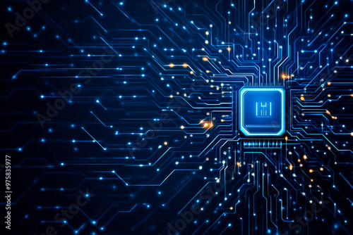 Glowing light blue neon chip with thin circuit contact lines.