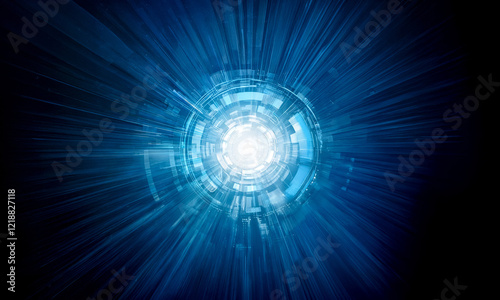 Glowing light circle or tunnel with blue radial rays. Modern, futuristic technology, power, burst, speed and motion abstract background. Future energy or space and time travel concept
