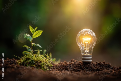 Glowing lightbulb on soil with sprout