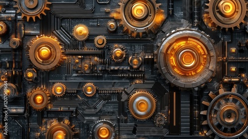 Glowing mechanical gears integrated into a digital network, representing advanced automation systems and efficiency