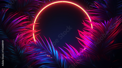 Glowing neon border embracing abstract palm leaves
