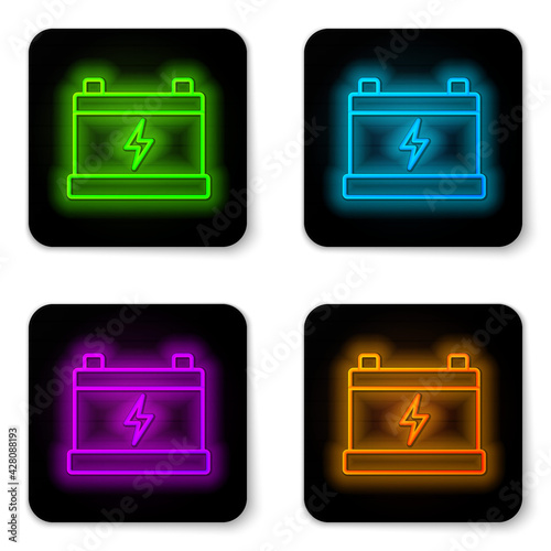 Glowing neon line Car battery icon isolated on white background. Accumulator battery energy power and electricity accumulator battery. Black square button. Vector