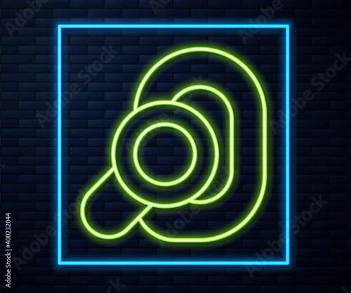 Glowing neon line Hearing aid icon isolated on brick wall background. Hearing and ear. Vector.