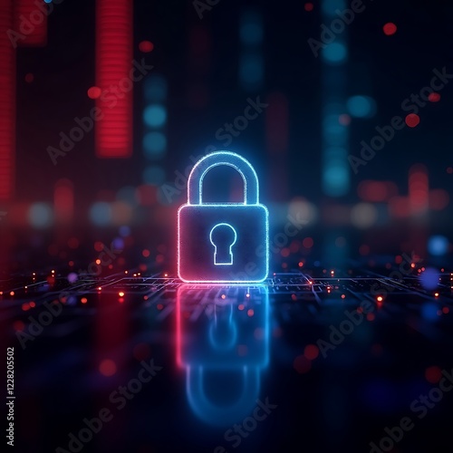 Glowing neon padlock cybersecurity concept digital network abstract background