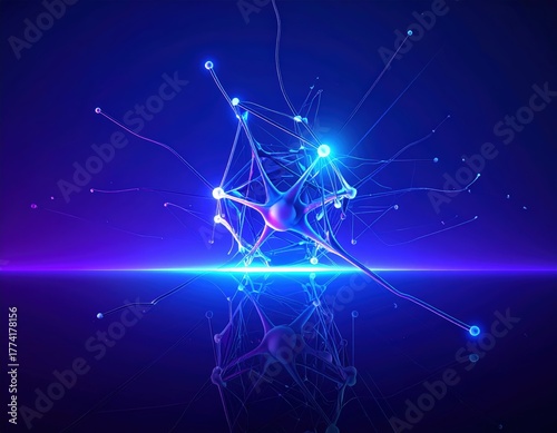 Glowing Neuron Network with Axons and Synapses on Reflective Surface in Blue