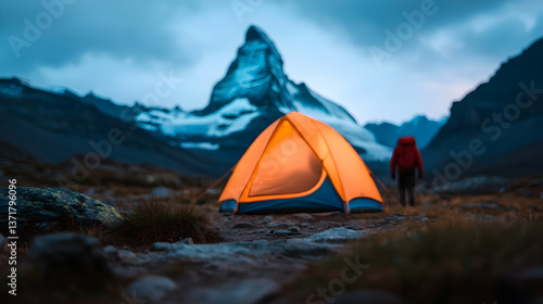 Glowing Orange Tent in Mountain Dusk