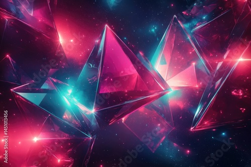 Glowing pink and teal crystal pyramids float in a cosmic space, creating a vibrant, abstract scene.