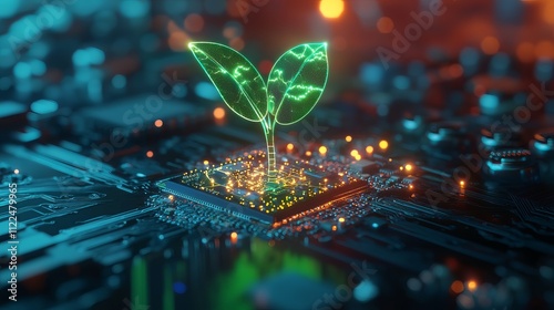 Glowing plant growing on computer chip symbolizing digital ecology and technology innovation