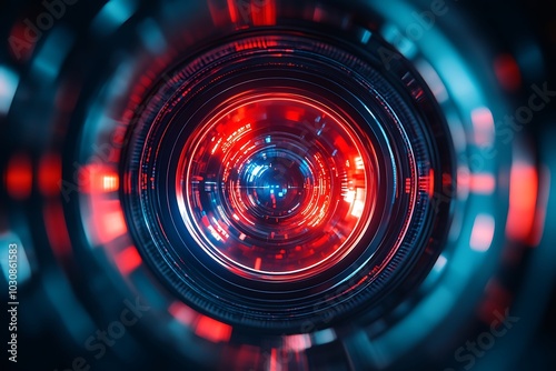 Glowing Red and Blue Camera Lens with Bokeh Effects