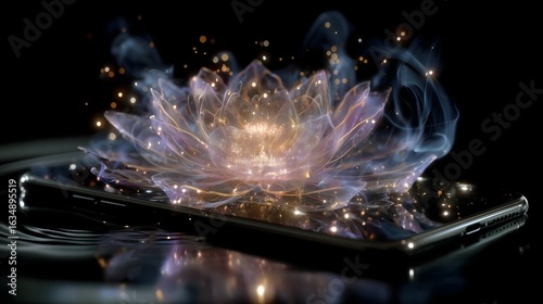 Glowing sacred lotus flower emerges from a smartphone in a tranquil setting at twilight