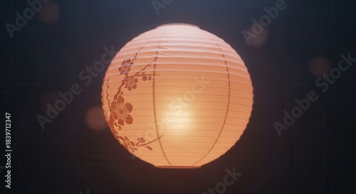 Glowing spherical paper lantern decorated with floral patterns illuminates the dark background