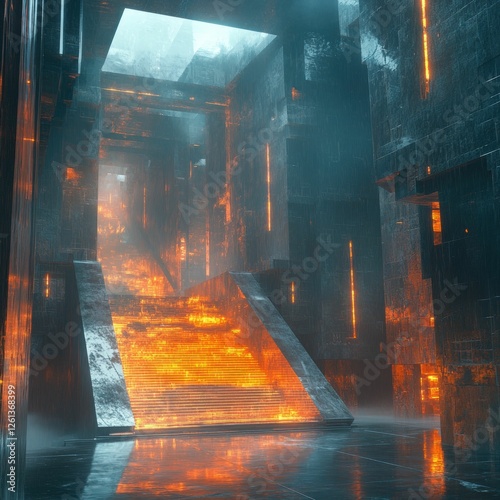 Glowing staircase in futuristic, wet structure