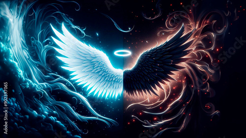 Glowing white angel wing vs black demon wing, good vs evil illustration