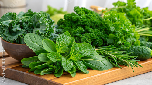 Gluten Free Anti-Inflammatory Plan. Fresh greens and herbs arranged beautifully on wooden board