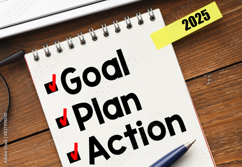 Goal,plan,action text on notepad with office accessories.Business motivation,inspiration concepts ideas