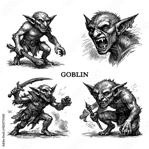 Goblin vintage engraved illustration, mythical creature, fantasy monster, black and white art