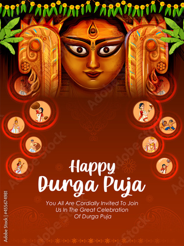 Goddess Durga Face in Happy Durga Puja Subh Navratri Indian religious header banner background