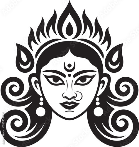 Goddess Durga with Trishul Silhouette Design Durga Face with Third Eye Vector Art Traditional Durga Puja Celebration Silhouette Durga Idol with Lion and Mahishasura Vector Devotional Durga Puja Sc