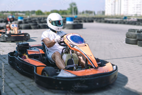Go-Kart racing car on the track in action, championship, active sports, extreme fun, the driver keeps his hands on the wheel. driver protective gear. day, karting