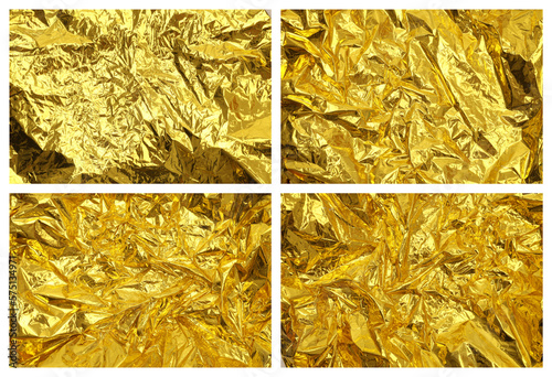 Gold and bronze glitter foil crumpled paper. Abstract glow shine texture copy space background. Set. Collection.