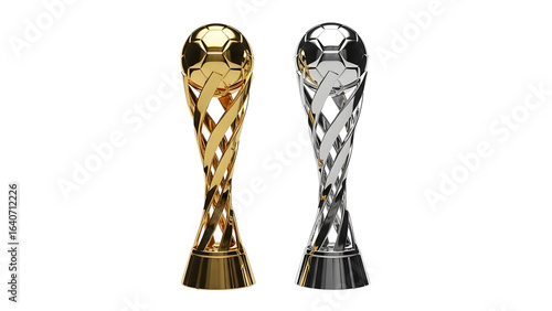 Gold and silver soccer trophy awards for champions achievements in sports competition illustration on transparent background