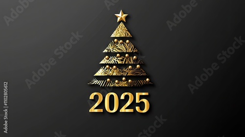 Gold Christmas Tree Design with Year 2025 on Dark Background