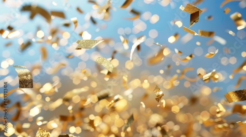 Gold confetti gently floats with a soft blue background, creating an atmosphere of celebration