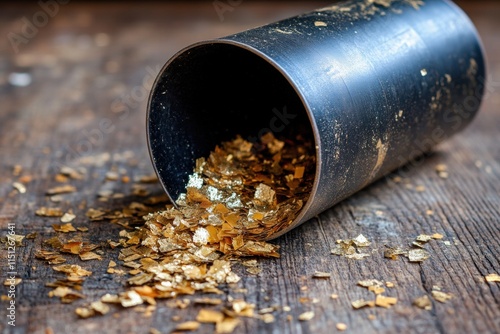 Gold Leaf Spilling from a Black Container onto a Wooden Surface