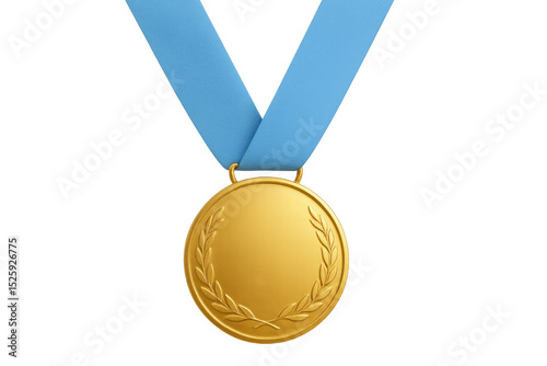 Gold medal with laurel wreath dangling from blue ribbon, symbolizing success and triumph against clean transparent backdrop