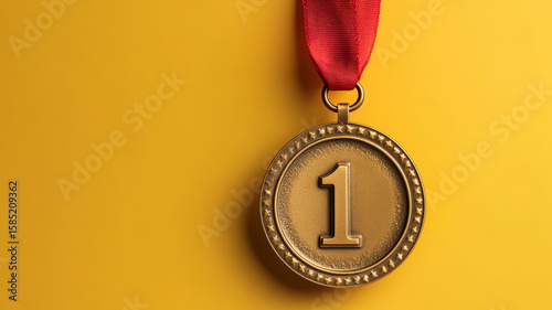 Gold medal with red ribbon on yellow background.