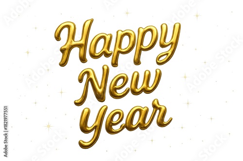 Golden 3D Happy New Year lettering with shiny highlights and tiny star sparkles on white background; festive holiday typography for cards, posters, banners.