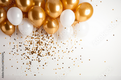 Golden and white balloons with confetti on white background