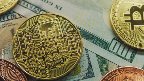 Golden bitcoin coins and hundred dollar banknotes with Benjamin Franklin. Cryptocurrency and paper money. 100 US dollar bills and virtual currency. Finance and investment concept. Extreme Close Up.
