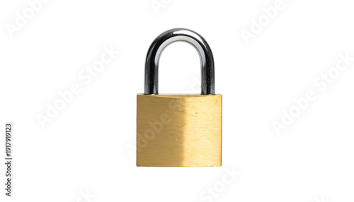 Golden brass padlock with silver shackle, isolated on black