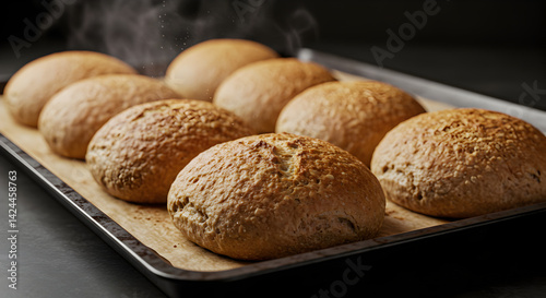 Golden Brown Bread Rolls Freshly Baked And Steaming On A Baking Sheet