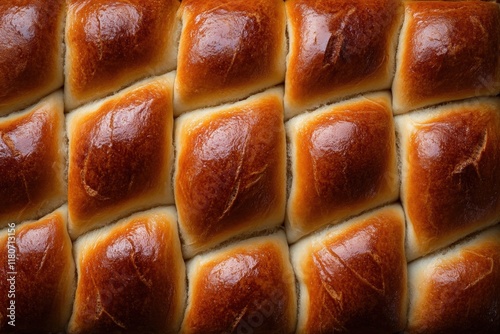 Golden Brown Buns Arranged in Neat Rows on Wooden Surface